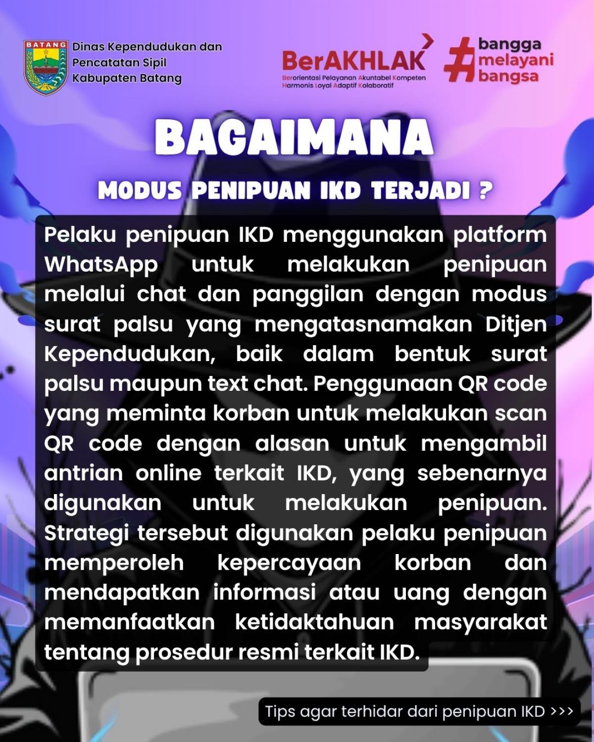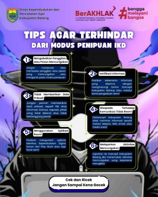 Dinas Kependudukan dan Pencatatan Sipil Kabupaten Batang (Disdukcapil Kabupaten Batang) mengimbau masyarakat untuk lebih waspada terhadap modus penipuan yang mengatasnamakan layanan Identitas Kependudukan Digital (IKD).